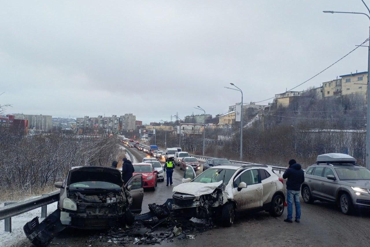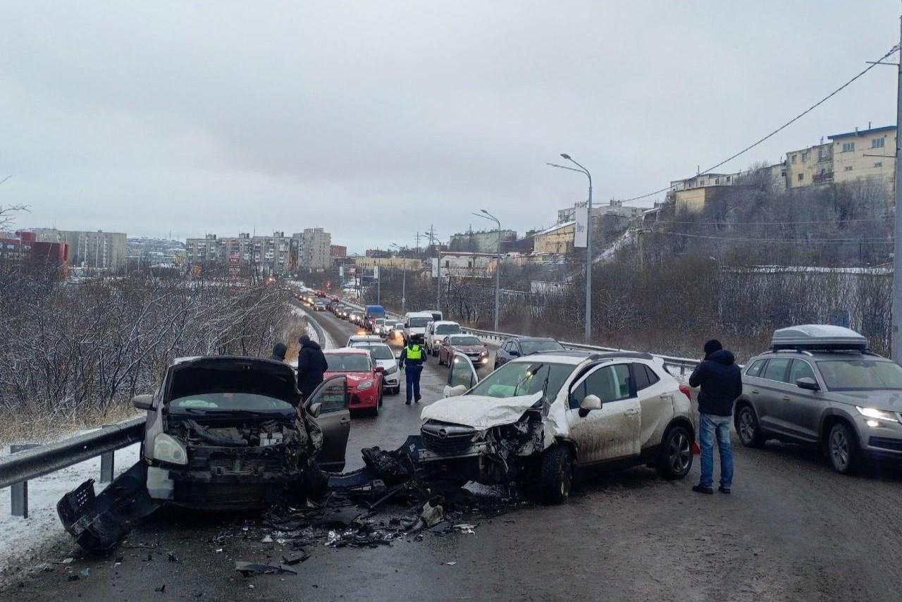 От капотов осталось одно железо: в Мурманске на улице Рогозерской произошло жесткое ДТПДвижение на трассе затруднено